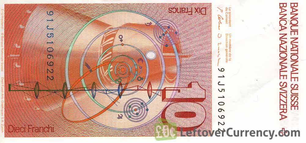 The Swiss National Bank issued Swiss Franc banknotes in 8 different denominations, including this 10 Swiss Francs banknote (Leonhard Euler 6th Series). They are part of the withdrawn Swiss Franc banknotes series. The Swiss National Bank started issuing these 10 Swiss Franc banknotes in 1979. They were withdrawn from circulation in 2000.