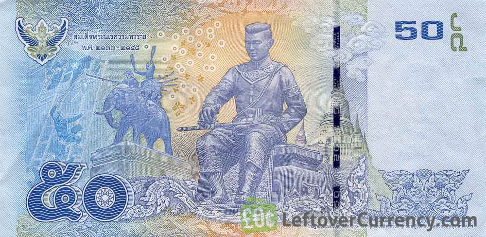 The 50 baht note features the updated portrait of His Royal Highness Rama IX of Thailand. The seated figure on the back of this blue banknote is King Naresuan the Great, pouring water to symbolise the independence of the Ayutthaya Kingdom from the Burmese Taungoo Empire towards the end of the 16th century. King Naresuan is well known in Thailand for his elephant battle against the Burmese Crown Prince Mingyi Swa.