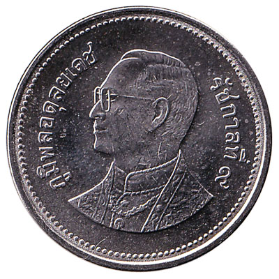 The Royal Thai Mint issued Thai Baht coins in 9 different denominations, including this 2 Thai Baht coin (silver coloured). They are part of the Thai Baht coins series. The Royal Thai Mint started issuing these 2 Thai Baht coins in 2005. They are currently still in circulation.