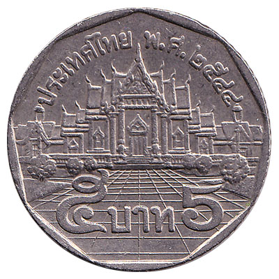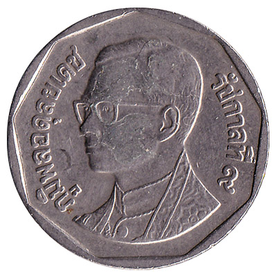 The Royal Thai Mint issued Thai Baht coins in 9 different denominations, including this 5 Thai Baht coin. They are part of the Thai Baht coins series. The Royal Thai Mint started issuing these 5 Thai Baht coins in 1988. They are currently still in circulation.