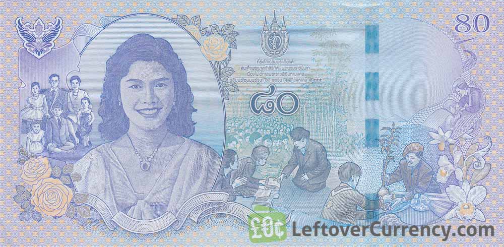 The commemorative banknote of 80 Thai Baht was issued to celebrate Queen Sirkit 80th birthday. The front shows a portrait of the eighty year old Queen and her husband King Rama IX Bhumibol Adulyadej, both wearing traditional robes from Thailand. On the back of the 80 THB bill is a portrait of a young Queen Sirkit.