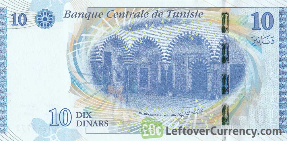 The Tunisian poet Abou El Kacem Chebbi is pictured on this blue-coloured banknote of 10 dinars dated 2013. On the back side of the 10 DT bill is an image of Madrasa El Bachia in the medina of Tunis.