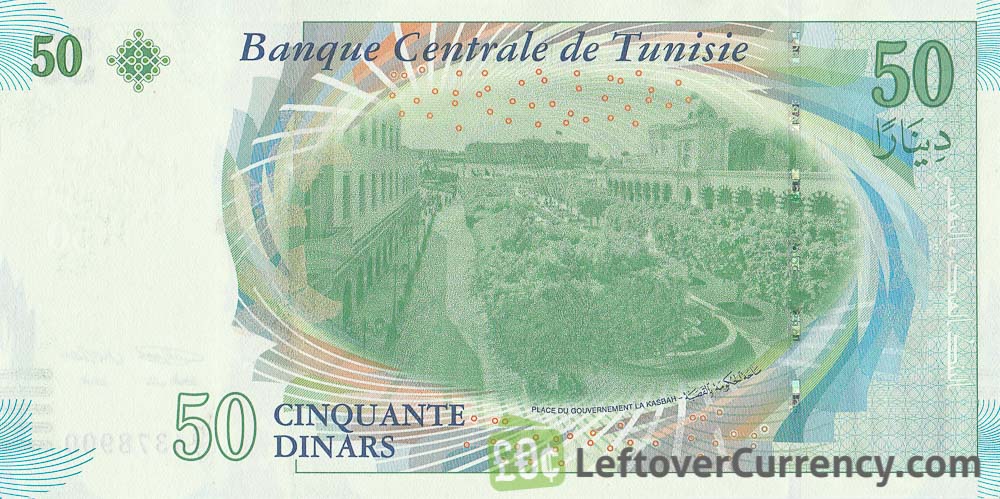 On the front side of the 50 Tunisian Dinars banknote dated 2011 is the Musée de la Monnaie (Money Museum) in Tunis, along with the portrait of writer and poet Ibn Rachiq. On the back side of the 50 DT bill is a view on Place du gouvernement in the La Kasbah district of Tunis. The 2011 dated banknote replaced an older but similar looking version dated 2008, that one is no longer legal tender.