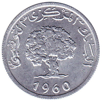 The Central Bank of Tunisia issued Tunisian Dinar coins in 12 different denominations, including this 1 Millième coin Tunisia. They are part of the Tunisian Dinar coins series. The Central Bank of Tunisia started issuing these 0.001 Tunisian Dinar coins in 1960. They were withdrawn from circulation in 1990.