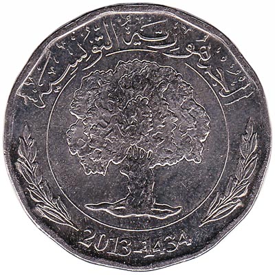 The Central Bank of Tunisia issued Tunisian Dinar coins in 12 different denominations, including this 2 Dinars coin Tunisia. They are part of the Tunisian Dinar coins series. The Central Bank of Tunisia started issuing these 2 Tunisian Dinar coins in 2013. They are currently still in circulation.