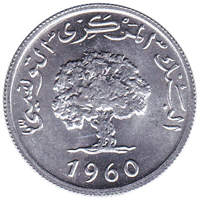 The Central Bank of Tunisia issued Tunisian Dinar coins in 12 different denominations, including this 2 Millièmes coin Tunisia. They are part of the Tunisian Dinar coins series. The Central Bank of Tunisia started issuing these 0.002 Tunisian Dinar coins in 1960. They were withdrawn from circulation in 1983.