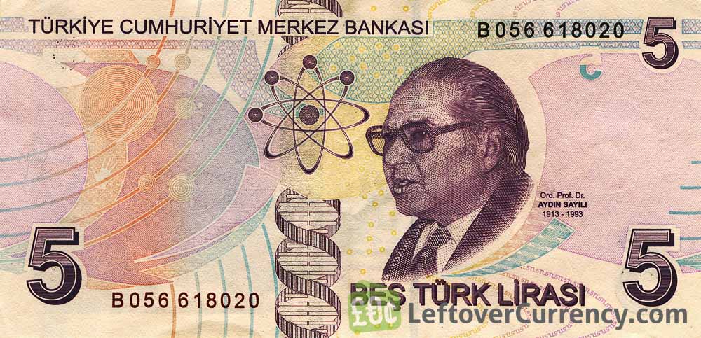 This bes turk lirasi note shows Mustafa Kemal Atatürk and Aydin Sayili. The brown and yellow colored paper bill contains the words ‘Turkiye Cumhuriyet Merkez Bankasi’. The backside of the 5 TRY banknote features Aydin Sayili, historical scientist.