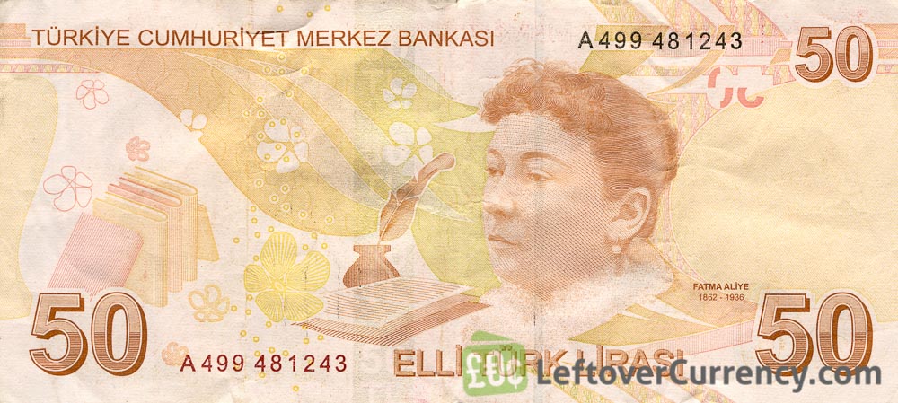 This elli turk lirasi banknote portrays Kamel Ataturk and Fatma Aliye. Text on the brown and green colored paper note reads ‘Turkiye Cumhuriyet Merkez Bankasi’. The backside of the 50 Turkish lira note features writer Fatma Aliye.