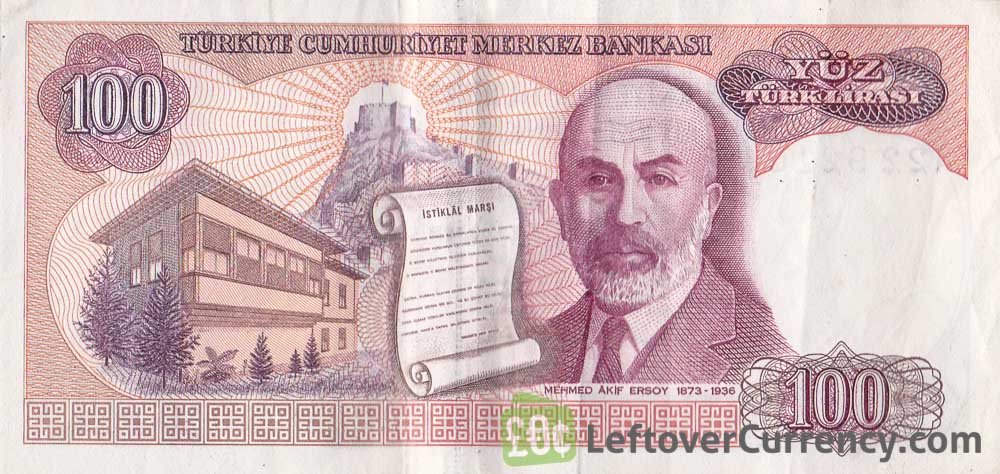 The 100 Turkish Lira bill from the 7th emission group is dated 1970. Its value is almost all wiped out by many years of high inflation. The backside of the 100 TRL note has a portrait of Turkish writer and poet Mehmet Akif Ersoy.