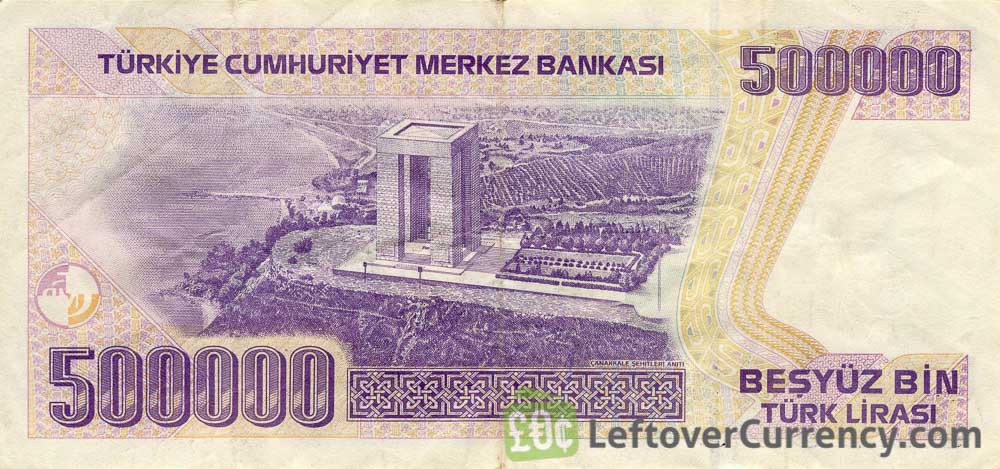 The bill of besyuz bin turk lirasi portrays Mustafa Kemal Atatürk, 1st President of Turkey. On the paper banknote a caption reads ‘Turkiye Cumhuriyet Merkez Bankasi’. The value of a 500,000 old Turkish Lira banknote is very low as a result of years of high inflation in Turkey. Six zeroes were dropped and this banknote was replaced by a coin of 0.50 new Turkish lira in 2005.
