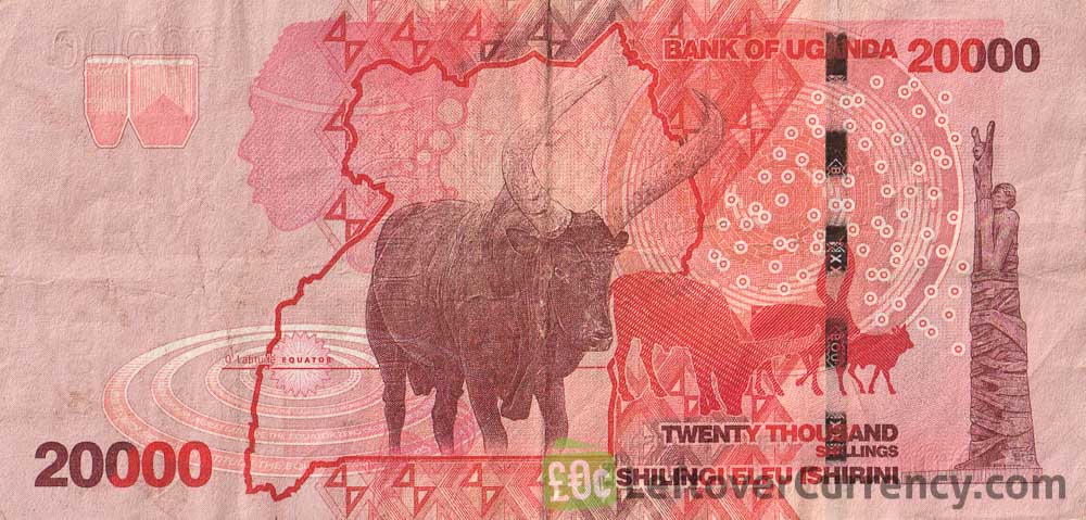 The front side of this 20,000 Ugandan Shilling bill features the Socio-Economic Growth of Kampala City Monument in Centenary Park, also known as the Centenary Monument. The reverse side of the 20,000 UGX banknote features drums and a long-horned bull.