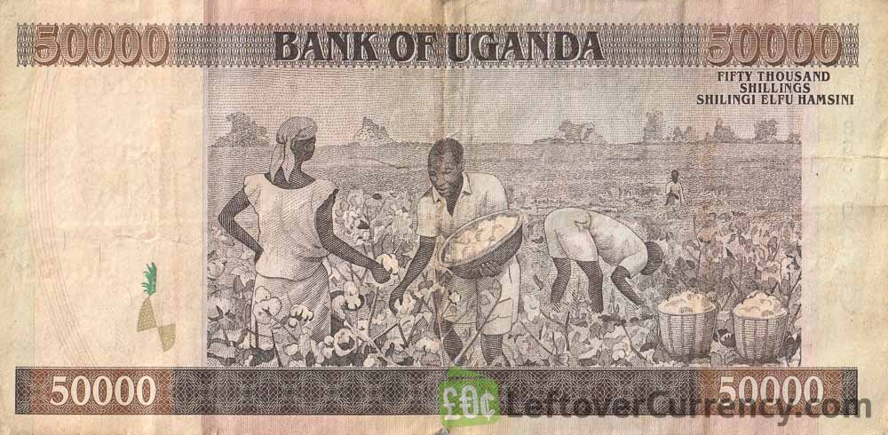 The Bank of Uganda issued Ugandan Shilling banknotes in 13 different denominations, including this 50000 Ugandan Shillings banknote (cotton harvest). They are part of the demonetised Ugandan Shilling banknotes series. The Bank of Uganda started issuing these 50000 Ugandan Shilling banknotes in 2003. They were withdrawn from circulation in 2013.
