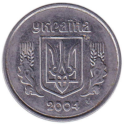 The coin of 2 kopiyka from Ukraine features Ukraine’s coat of arms: a pitchfork on a shield. The ₴0.02 UAH coin is made of nickel plated steel and weighs only 2 grams. Elements on the 2 kopiyka piece include grain stalks, branches, leaves and berries.