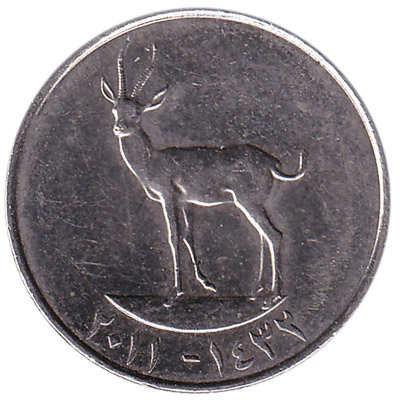 The 25 fils coin from the United Arab Emirates weighs 3.5 grams and measures 20mm across. The copper-nickel 1/4 Emirati Dirham piece features a gazelle and Arabic text.
