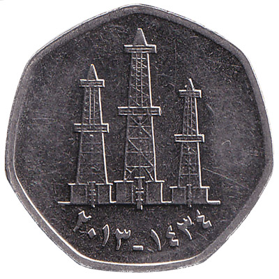 The 50 fils piece from the United Arab Emirates weighs 4.4 grams and has a diameter of 21mm. The copper-nickel 1/2 Emirati Dirham coin features three oil derricks and text in Arabic.