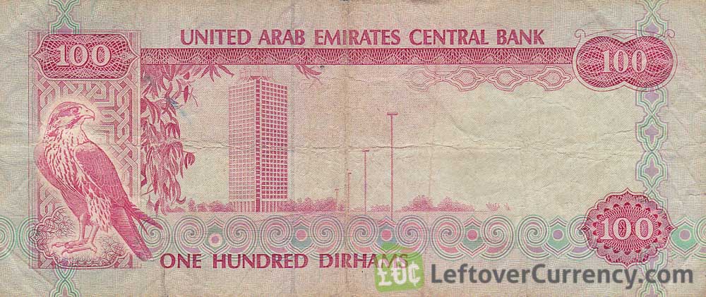 The Central Bank of the United Arab Emirates issued UAE Dirham banknotes in 8 different denominations, including this 100 UAE Dirhams banknote (no date). They are part of the withdrawn UAE Dirham banknotes series. The Central Bank of the United Arab Emirates started issuing these 100 UAE Dirham banknotes in 1982. They were withdrawn from circulation in 1996.