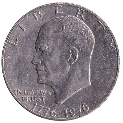 The US Mint issued American Dollar coins in 6 different denominations, including this 1 US Dollar coin (Eisenhower Bicentennial issue). They are part of the American Dollar coins series. The US Mint started issuing these 1 American Dollar coins in 1975. They were withdrawn from circulation in 1976.