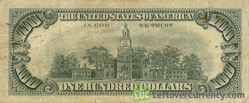 The Federal Reserve issued American Dollar banknotes in 10 different denominations, including this 100 American Dollars banknote series 1963. They are part of the previous series US dollar banknotes series. The Federal Reserve started issuing these 100 American Dollar banknotes in 1963. They were withdrawn from circulation in 2004.