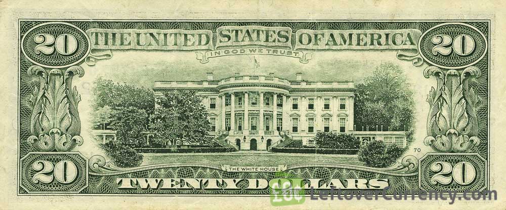 The Federal Reserve issued American Dollar banknotes in 10 different denominations, including this 20 American Dollars banknote series 1963. They are part of the previous series US dollar banknotes series. The Federal Reserve started issuing these 20 American Dollar banknotes in 1963. They were withdrawn from circulation in 2004.