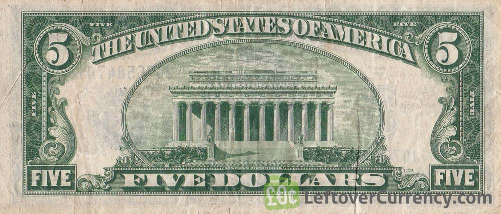 The Federal Reserve issued American Dollar banknotes in 10 different denominations, including this Five Dollars Silver Certificate blue seal. They are part of the previous series US dollar banknotes series. The Federal Reserve started issuing these 5 American Dollar banknotes in 1934. They were withdrawn from circulation in 1953.