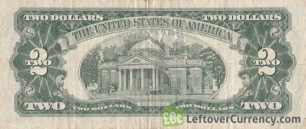 The Federal Reserve issued American Dollar banknotes in 10 different denominations, including this Two Dollars United States note red seal. They are part of the previous series US dollar banknotes series. The Federal Reserve started issuing these 2 American Dollar banknotes in 1928. They were withdrawn from circulation in 1963.