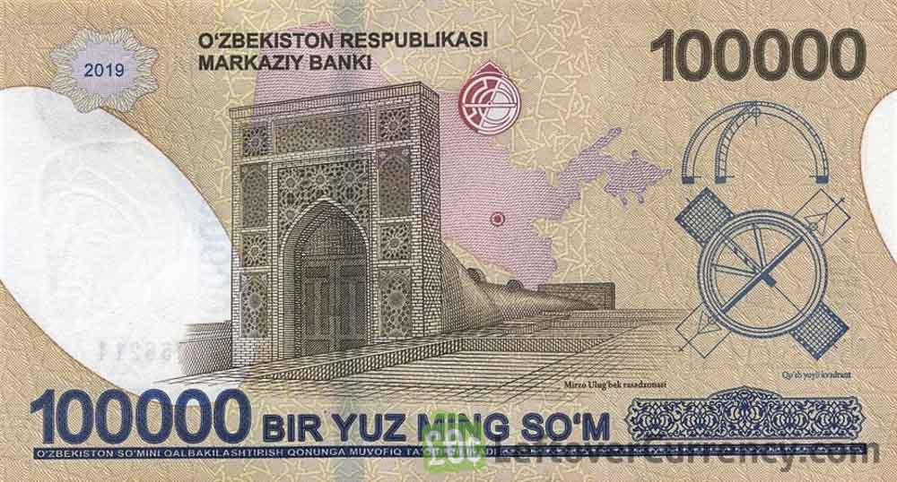 The Central Bank of the Republic of Uzbekistan issued Uzbekistani Som banknotes in 9 different denominations, including this 100000 Uzbekistani Som banknote (Ulugʻbek Observatory). They are part of the current Uzbekistani Som banknotes series. The Central Bank of the Republic of Uzbekistan started issuing these 100000 Uzbekistani Som banknotes in 2019. They are currently still in circulation.
