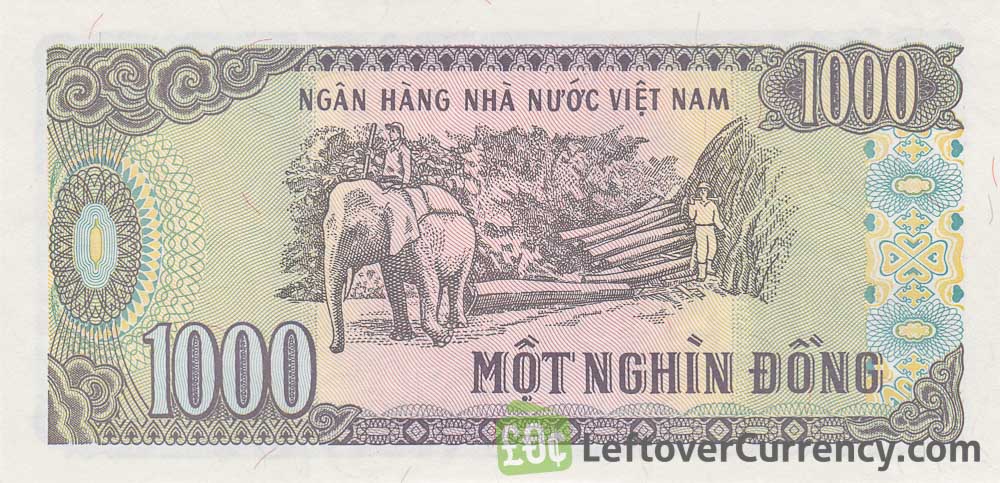 Vietnam’s 1000 dong banknote, dated 1988, is no longer in use as a means of payment today as it has been replaced by a 1000 VND coin. The paper banknote of 1000 Mot Nghin Dong has the portrait of Ho Chi Minh on the front side and shows an elephant pulling lumber on the back side.