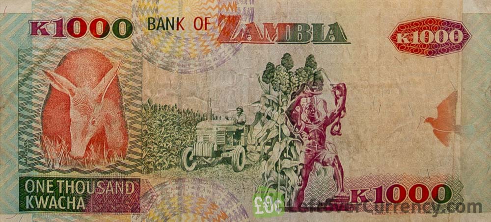 The paper banknote of 1,000 Zambian Kwacha forms part of the ‘old kwacha’ banknotes that were redenominated in 2013, dropping three zeroes. As a result, the equivalent value of 1,000 ZMK (old kwacha) is 1 ZMW (new, redenominated kwacha post-2013), The K1000 note features an aardvark, corn crops, a farmer on a tractor and Lusaka’s Freedom Statue on the reverse side. The front side is dated 1992, 2001 or 2003. Newer versions of the 1,000 ZMK note were made of polymer.