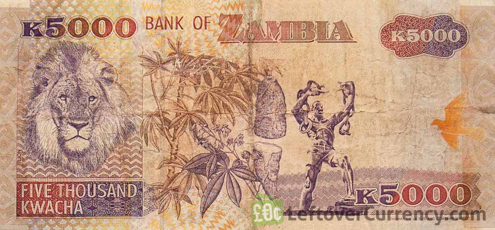 The 5,000 ZMK note was redenominated in 2013, its value equivalent to 5 ZMW today. The old 5,000 Zambian Kwacha note has the year 2001, 2003 or 2006 on the front side. The back side features a lion, cassava plant and the Freedom Monument in the capital city Lusaka.