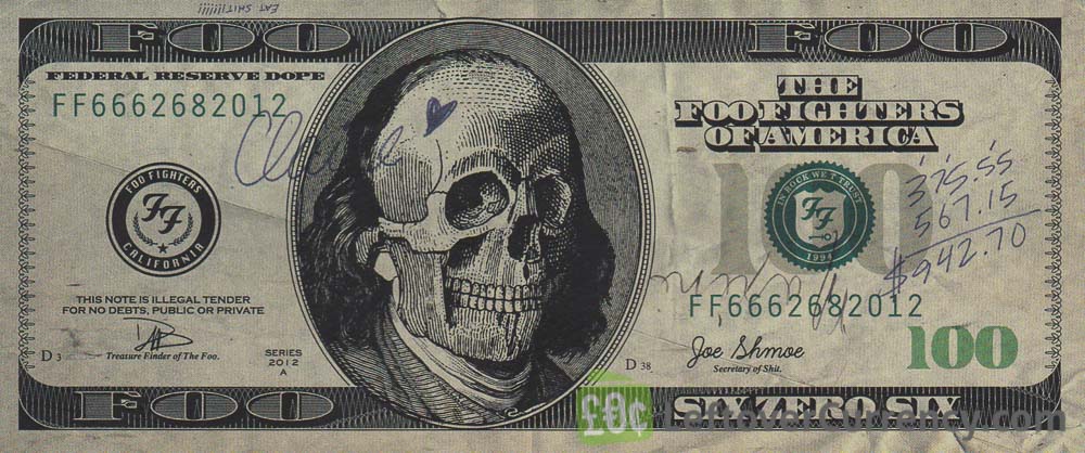15,000 of these rock star money bills were rained down on the Foo Fighters fans during the concert, launched from confetti cannons. From a distance the banknotes resemble $100 dollar bills. Upon closer inspection one can spot a number of interesting modifications. These include: