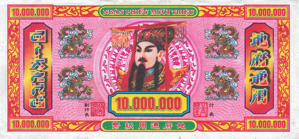 Living relatives offer Hell Money to the deceased by burning these banknotes, or by placing them in the coffin. The practice is common to the Ancient Greek ‘Charon’s obol’, a coin placed in or on the mouth of a dead person before burial. The ‘obol’ coin is meant to pay Charon, the ferryman of the Underworld.